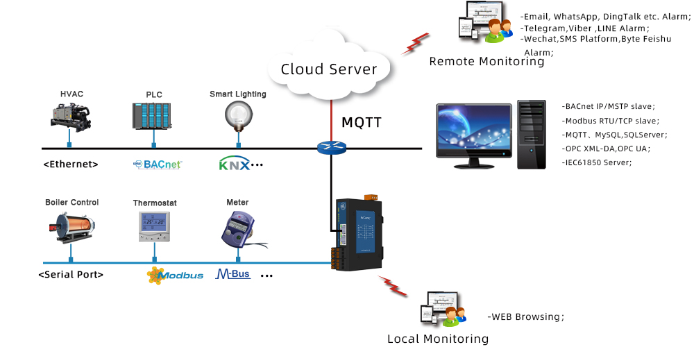 The IoT gateway HMI2004-Lite (with 2 Ethernet port, 4 RS485 serial ports, and dynamic support for 1024 points) is capable of collecting data from Modbus, BACnet protocols, and simultaneously forwarding it to Modbus, BACnet, OPC UA, MQTT and IEC61850 server,. At the same time, It can support WeChat Alarm, DingTalk Alarm, Email Alarm, as well as project uploading to the cloud.