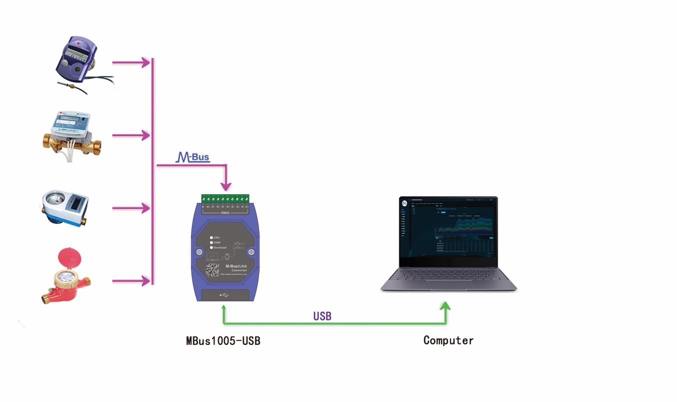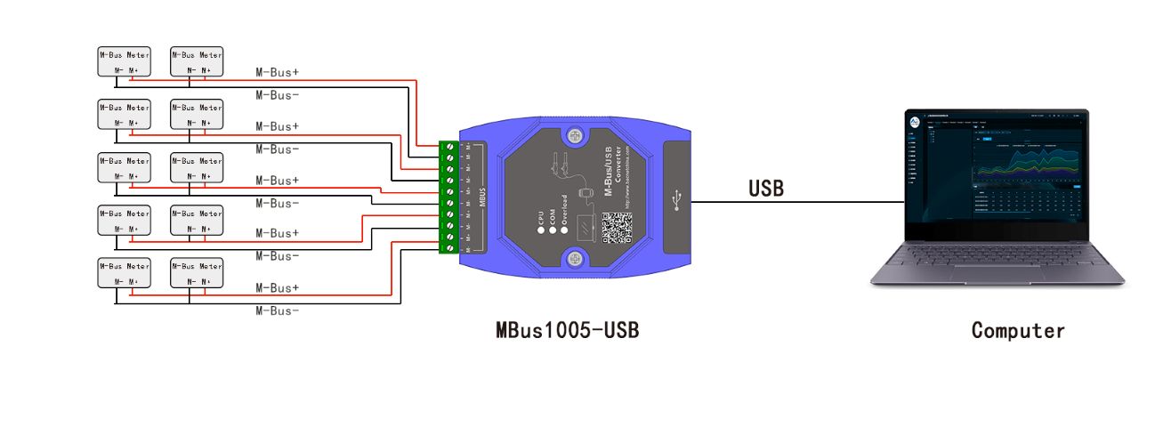 Milesgo MBus to USB converter connects to the MBus bus of terminal instruments such as heat meters and water meters through the MBus interface, and directly outputs USB signals on the other end. It can seamlessly interface with computer or gateways with USB interfaces, achieving fast access, data reading, and parameter debugging of terminal instruments.