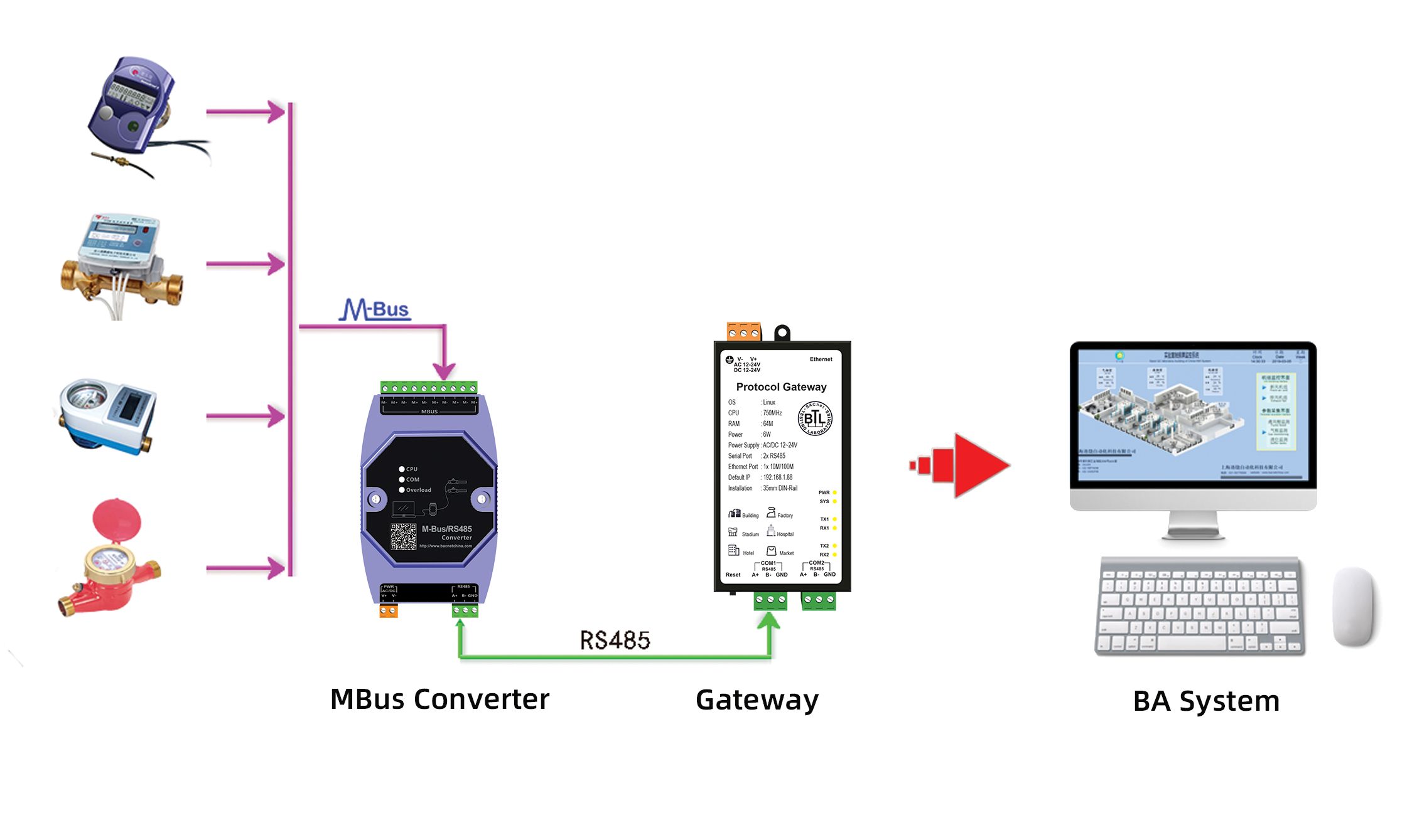 迅饶Mbus集中器通过Mbus接口连接到仪表Mbus总线,然后转换为RS485电平方式,这样可以让PC上位机或者串口设备访问终端仪表。