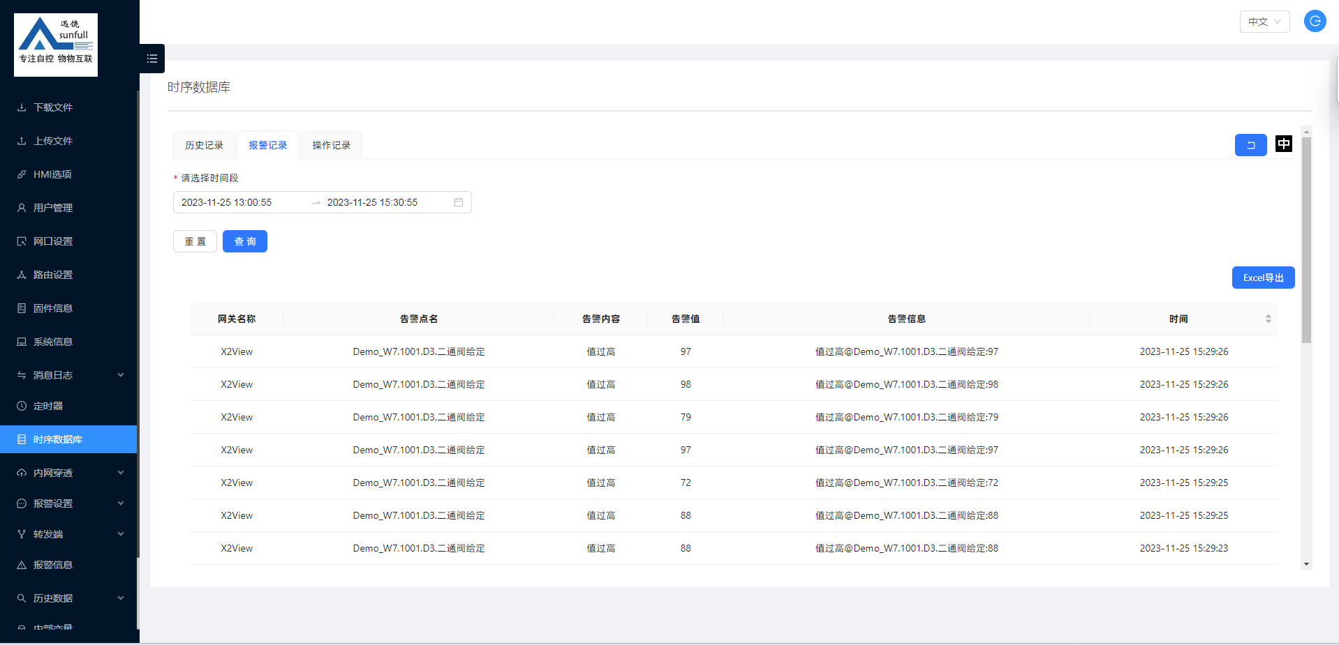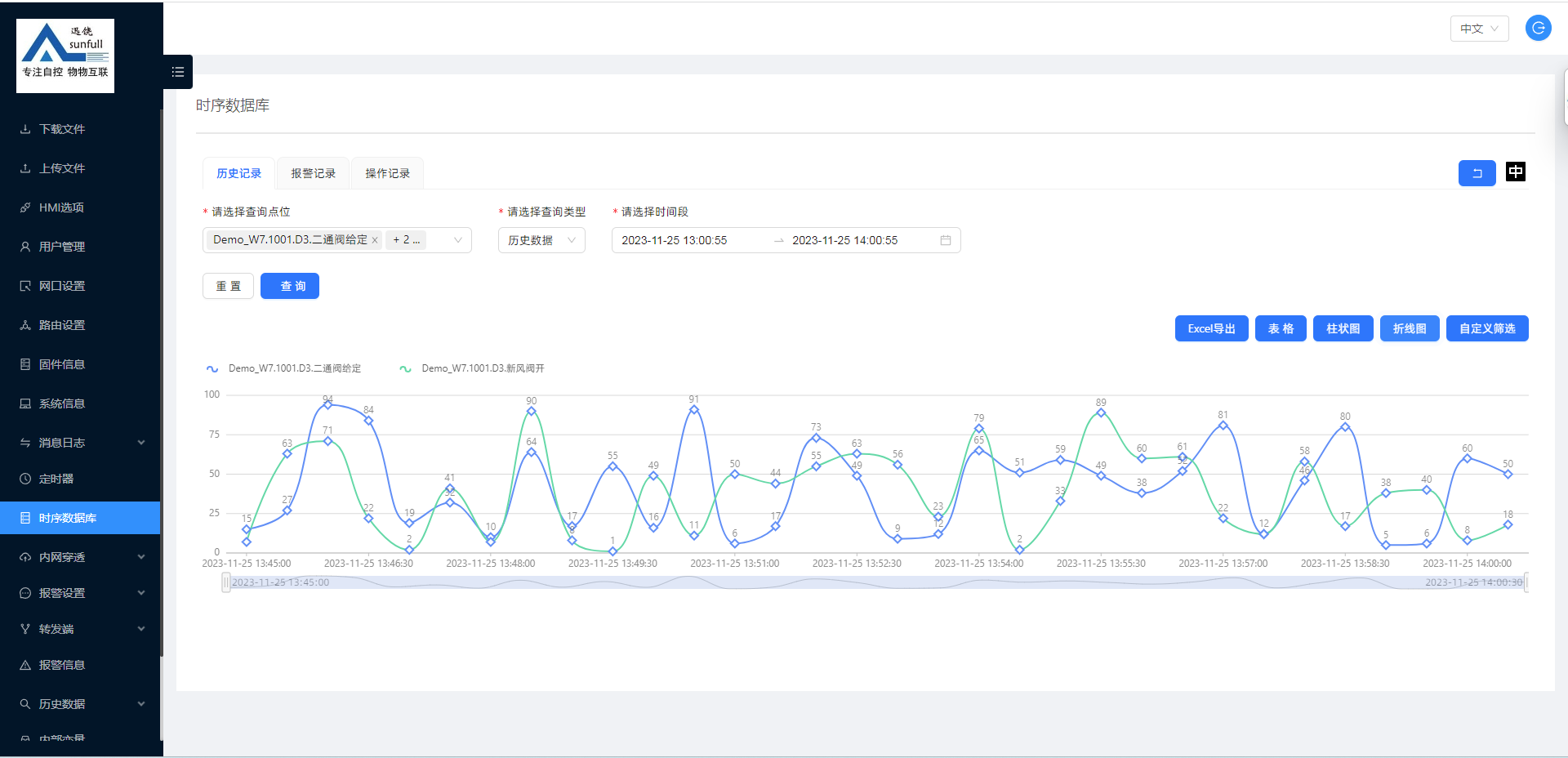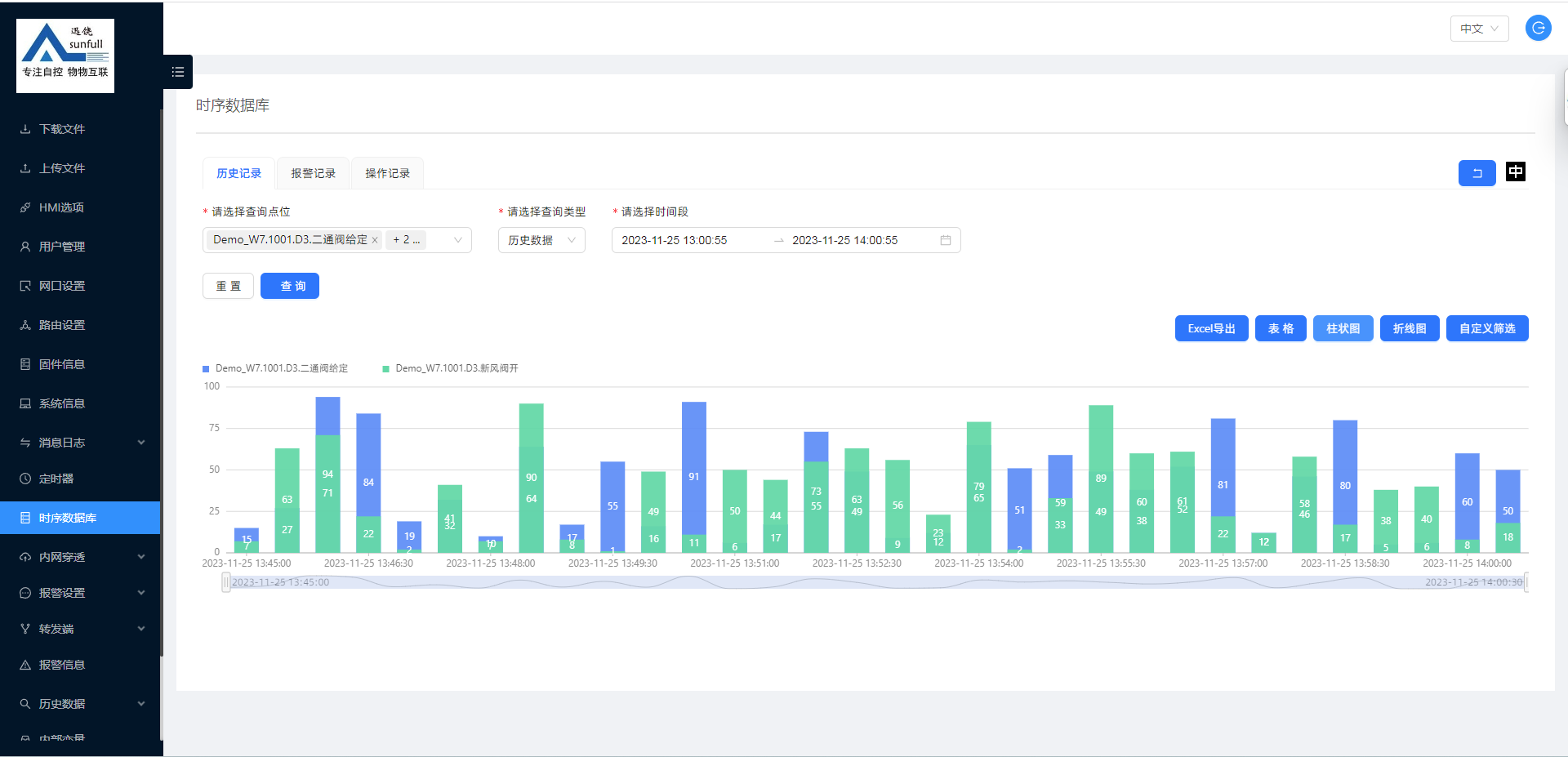 时序数据库可查询历史数据、报警记录、操作记录。历史数据可以柱状图、折线图展示,数据可导出EXECL方便用户查询。大概操作及展示如下: