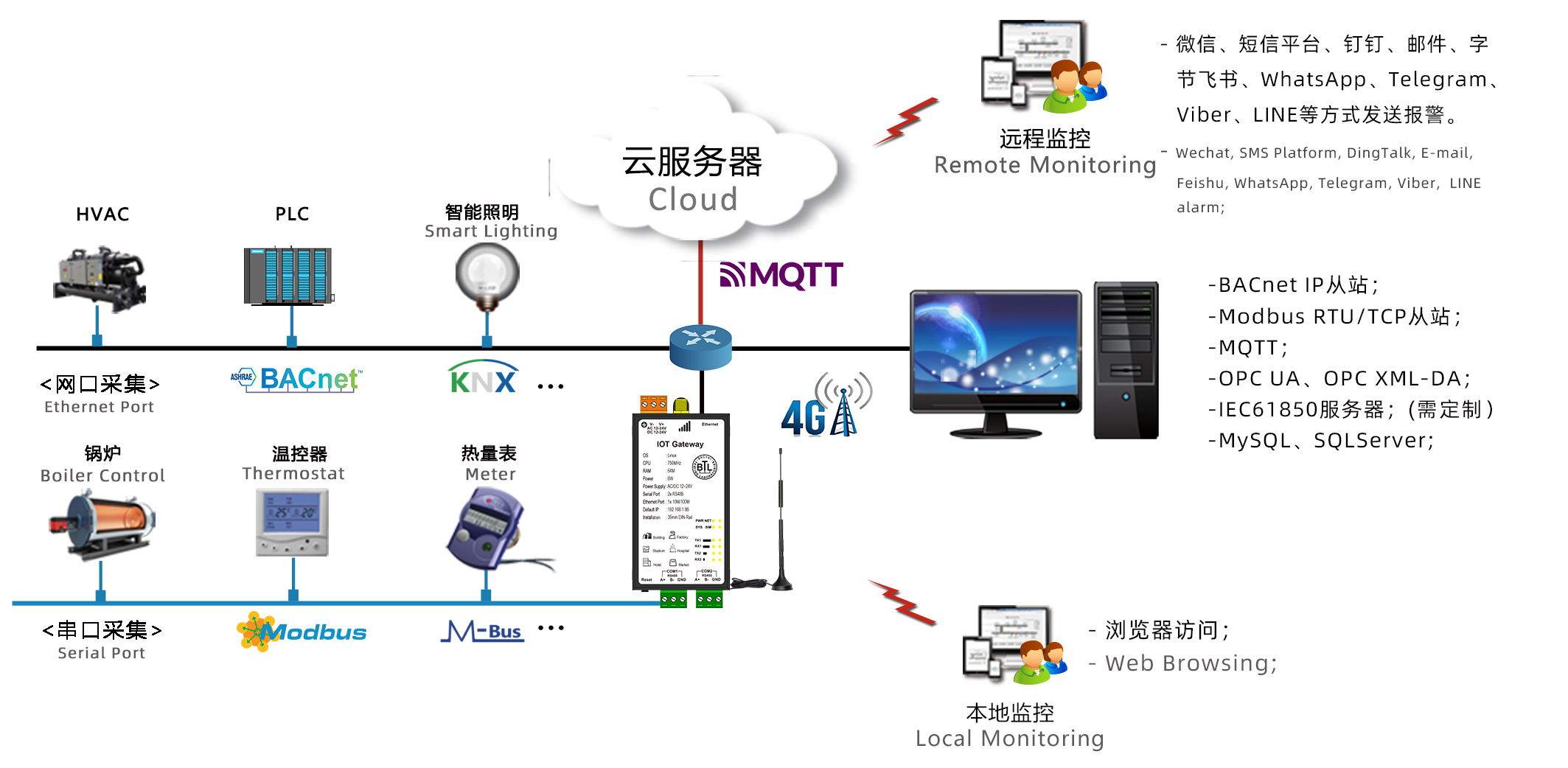 硬件网关HMI1002-Lite-4G配合组态编辑软件X2View可实现现场数据采集,并直接转为组态画面进行数据实时监控。采用4G全网通,方便实现串口数据到微信、短信等的转换,满足客户远程数据传输的需求。用户无需购买组态软件,只需用电脑、手机、iPad或自带浏览器功能的设备即可登录组态画面进行监控,实现远程监控设备启停、运行等操作,给用户带来良好的操作体验。同时具有微信报警、钉钉报警、邮件报警、短信报警、电话报警(选配)功能;还可以转发为BACnet服务器、Modbus服务器、IEC61850服务器、OPC UA服务器、MQTT服务器,开放HTTP WEB服务被第三方的系统集成。 工作原理