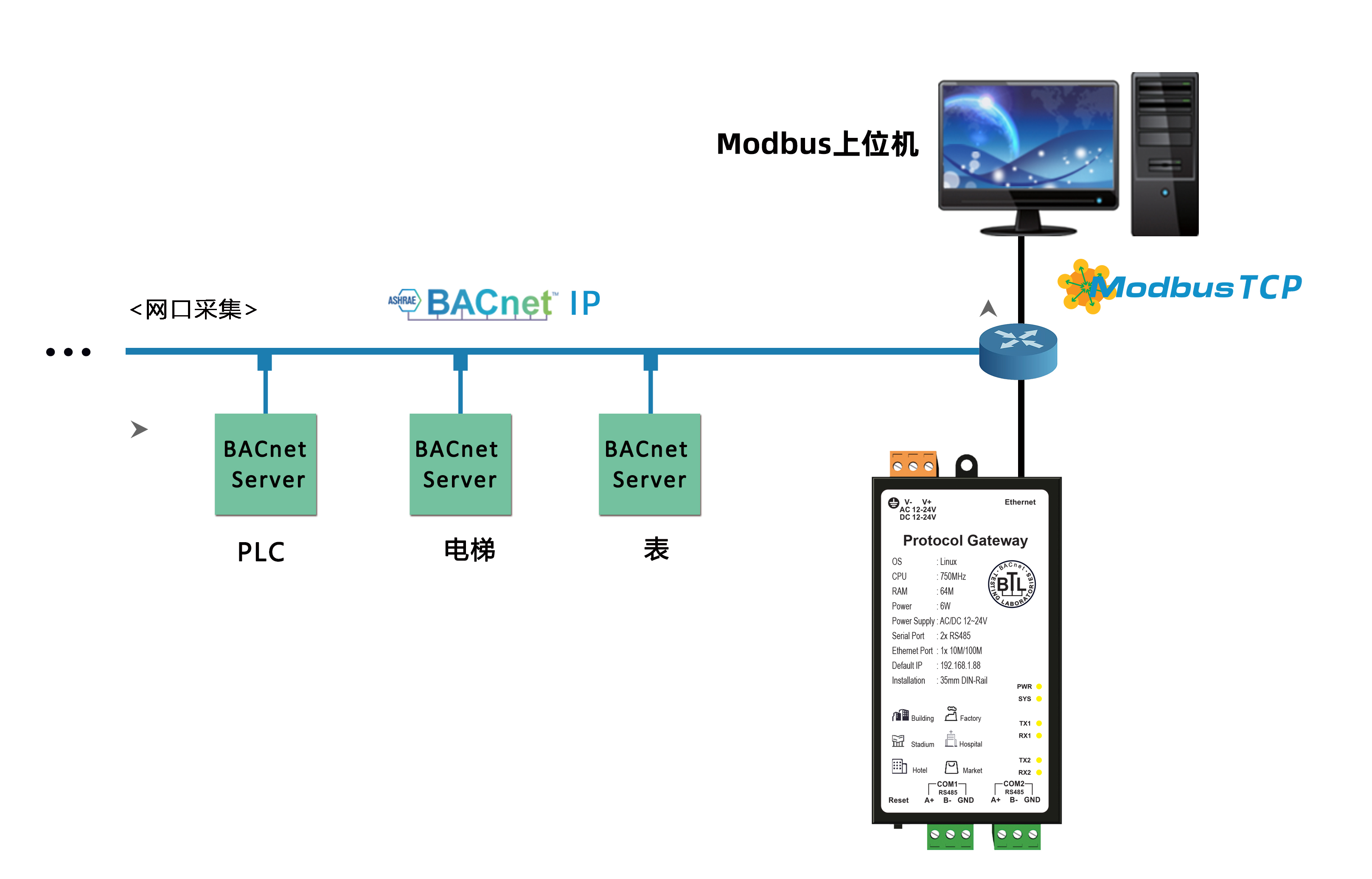 -支持常用Modbus 、BACnet 、Simulator协议同时转为Modbus TCP/RTU服务器; |