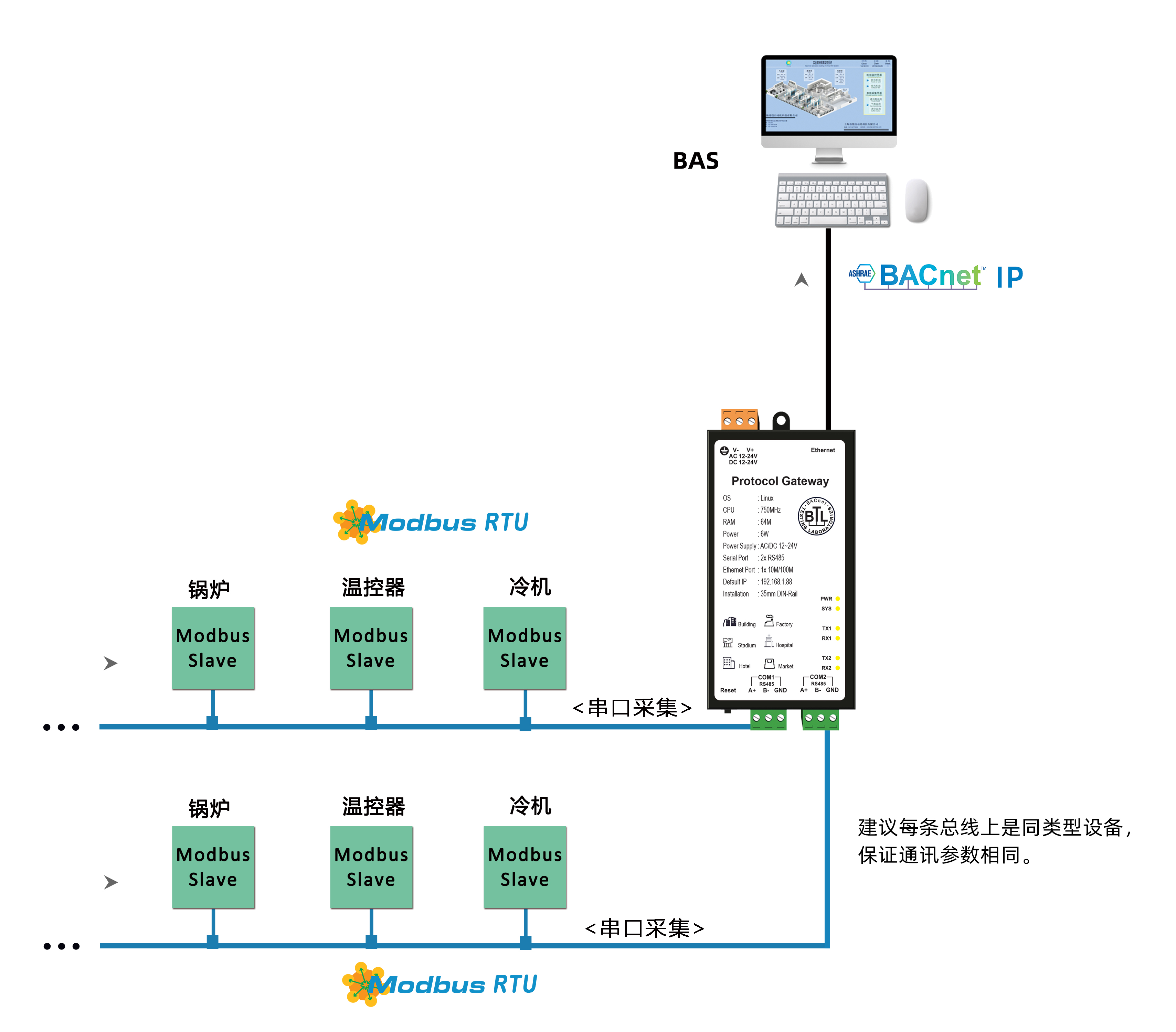 -支持常用Modbus、BACnet协议同时转为BACnet IP服务器; |